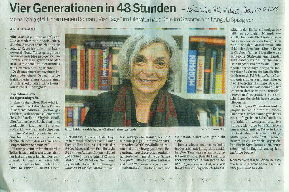 In einer beeindruckenden Lesung stellte am 20. Januar die in Bagdad geborene Autorin Mona Yahia ihren neuen Roman “Vier Tage – eine nahöstliche Tetralogie” vor. Moderiert wurde der Abend von Angela Spizig.